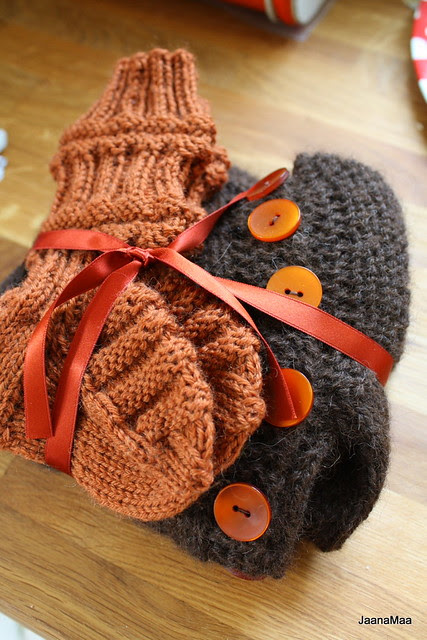 Pirkon Nyytille neuloin syksyllä neuletakinkin, Pirkko kun oli ihastunut aikaisemmin neulomiini samanmoisiin nappitakkeihin. Tämän tein kaksinkertaisesta Dropsin alpacasta ja oikein pehmoinen ja joustava tuli. Värit ovat ensimmäisessä kuvassa ylivalottuneet, takki on suklaanruskea ja junasukat (lankana vuorelman veto) tiilenoranssit. Langanmenekki ja muut yksityiskohdat unohtuneet jo mielestä...